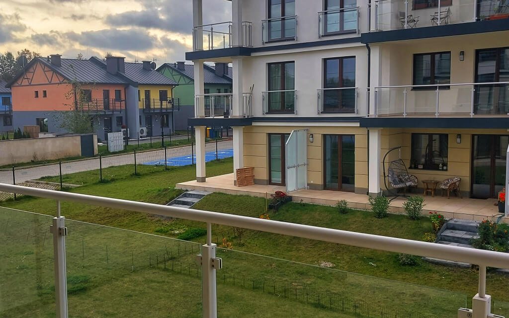 Teren osiedla jest ogrodzony, oświetlony i znajdują się na nim miejsca parkingowe dla mieszkańców.